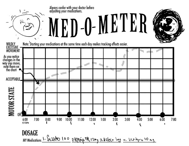 Most of us (but by no means all) adapt well to levedopa or other medications in the earlier stages after diagnosis. Then as time passes we find that we must fine-tune our timing to avoid motor fluctuations (off and on periods, dyskinesia, etc.) Graphing our dosages and timing is a good way to keep track. So I have drawn up a chart to make things easier. You're welcome. There is a pdf of the blank chart here for your downloading pleasure. When you download and print the chart, it should look like this